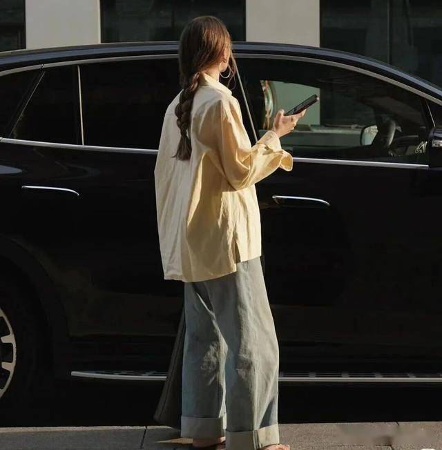 姜黄色的廓形衬衫,宽宽大大,会有一种很洒脱的感觉,可以配一条怀旧色的牛仔阔腿裤,既可以营造出复古一些的风格,又显得很年轻,喜欢这样懒洋洋的穿搭,看着就非常舒服。