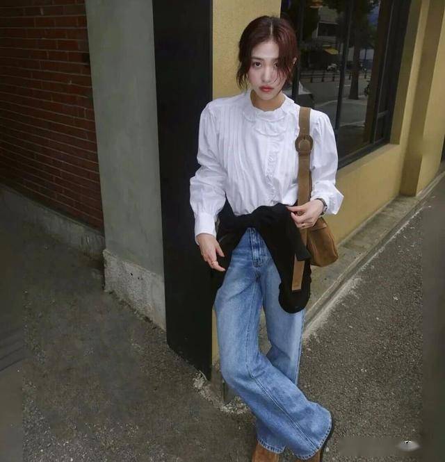 日常通勤,我们可以选择文雅一些的法式白衬衫,它比翻领衬衫多了一些设计感,比如小立领会显得温婉可爱一些,褶皱的设计会多一些精致感,配上牛仔阔腿裤,清爽的蓝白配色,看起来很有青春感。