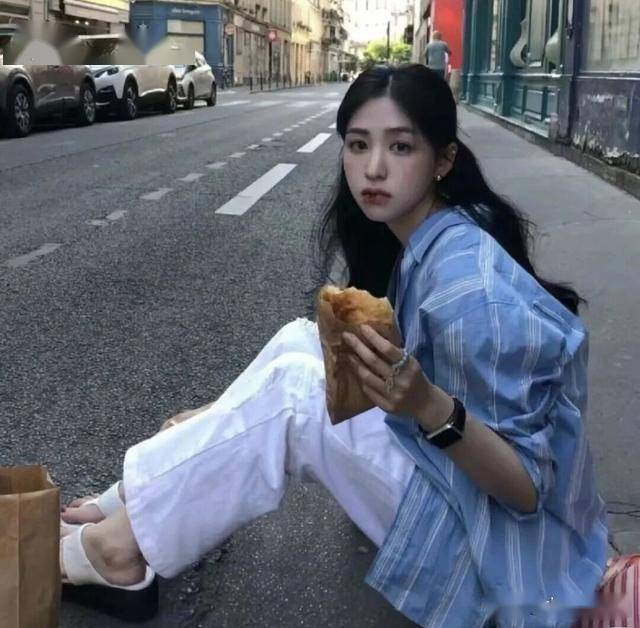 蓝色条纹衬衫,它自带硬朗帅气的少年感,可以配一条白色的牛仔裤,就是很学院风的味道,减龄效果OK。