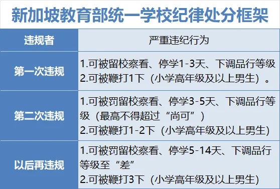 霸凌者将被停学、降级、打鞭 经过内部检讨,以及与2000多名教育工作者、家长、学生和专家沟通后,新加坡教育部确定了防霸凌新规,将于今年逐步推行,明年全面落实。 和以往学校各自处罚、标准不一不同,这次新规最大的变化是——统一处罚标准,针对霸凌、打架、严重恶作剧等行为,明确处罚,绝不姑息。