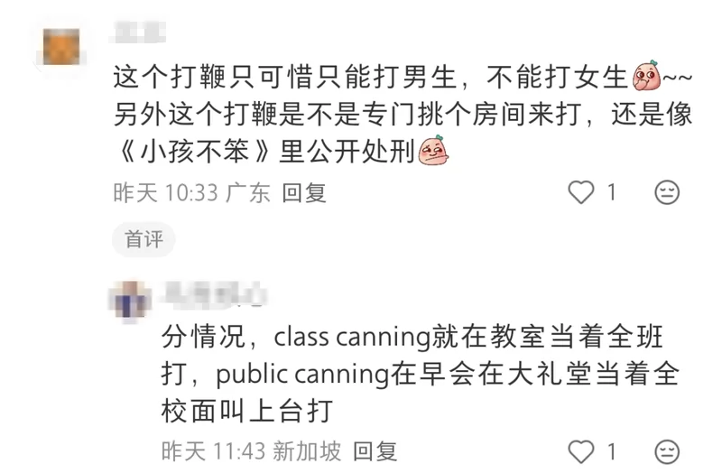 疑问2:打鞭是私下打,还是公开处刑? 有中国网友好奇,这种体罚是私下进行,还是公开警示? 有新加坡网友回复:课堂体罚会在教室当着全班打,公开处刑则会在大礼堂当着全校打。