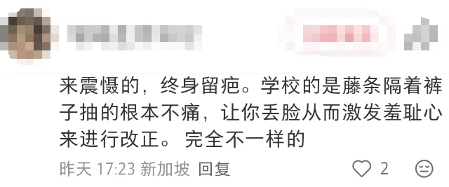 疑问3:学校鞭打和新加坡鞭刑有区别吗? 很多人会把学校的鞭打和新加坡的鞭刑混淆,有网友专门解释:两者完全不同。 鞭刑是用于震慑严重犯罪的刑罚,会终身留疤;而学校的鞭打是隔着裤子抽,目的是激发霸凌者的羞耻心,促使其改正错误,并非刻意造成身体伤害。