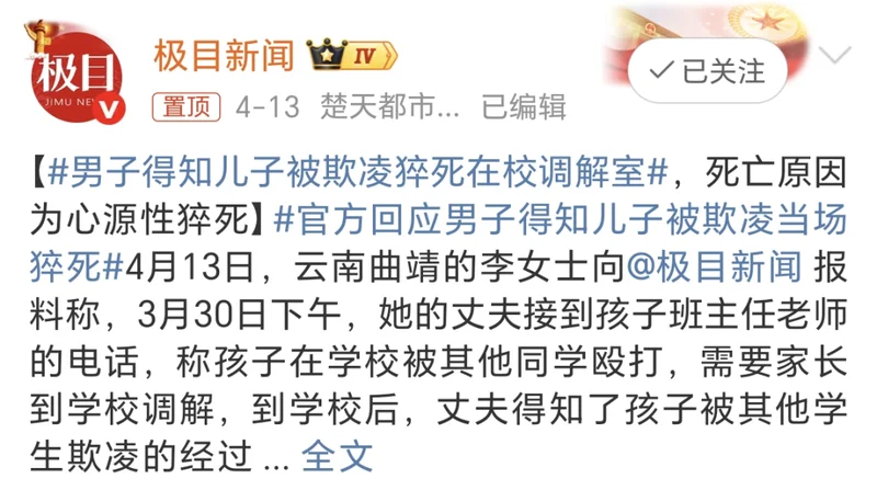 看看最近中国云南曲靖,一名父亲得知15岁儿子被欺凌、索要钱财、殴打后,在学校调解室情绪激动心源性猝死,太令人痛心了,严厉处罚或许能避免更多悲剧。