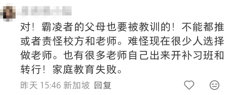 还有人认为,霸凌者的父母也该被追责,不能把所有责任都推给学校和老师。