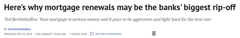 最近,一位客户告诉我,他的房贷将在1月底到期续约。就在当月早些时候——距离续约大约只有4周——他从自己的银行(加拿大六大银行之一)收到了一份房贷续约表格。他问我应该选择哪个期限,因为他对上面的利率并不满意。