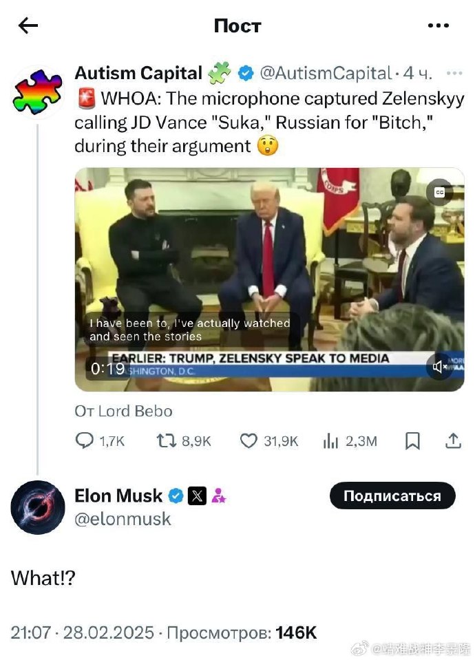 地球镜头A 美媒:泽连斯基在与美国副总统争吵时骂其“Bitch” 现场麦克风捕捉到了万斯开喷时,泽连斯基嘴里嘟囔了一个俄语单词“Cyka”,即E文“Bitch”。 事态愈发严重。 不知懂帝在看到媒体报道后能不能忍了 ...
