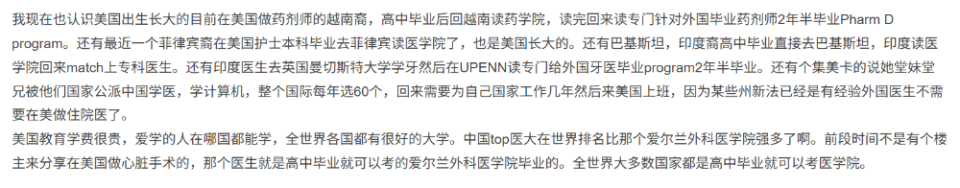 也并非华人家长的“专属”操作。越南裔、菲律宾裔、印裔、巴基斯坦裔的家长都有过类似操作,送自己在美国长大的娃回国去本国名校接受本科教育,学医、牙医、计算机专业的都有。
