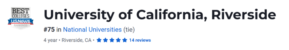如果按常规申请,她家娃大概能进UC Riverside。这所大学其实已经很不错了,排名在全美第75位,本州学费约1.5万美元一年,算上住宿和生活费用,每年要花2.5–3万美元。
