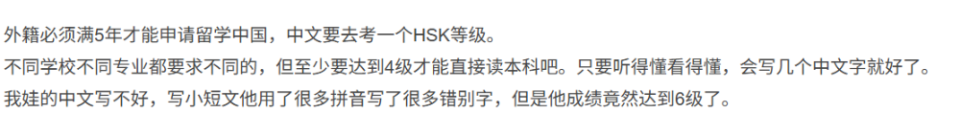 这位送孩子去北京读书的华人家长就说,自家娃中文其实并不好,写短文会有很多错别字、也会用拼英代替,但居然也有汉语六级水平了。相较于中国留学生考的托福、GRE难度系数不是一个量级。