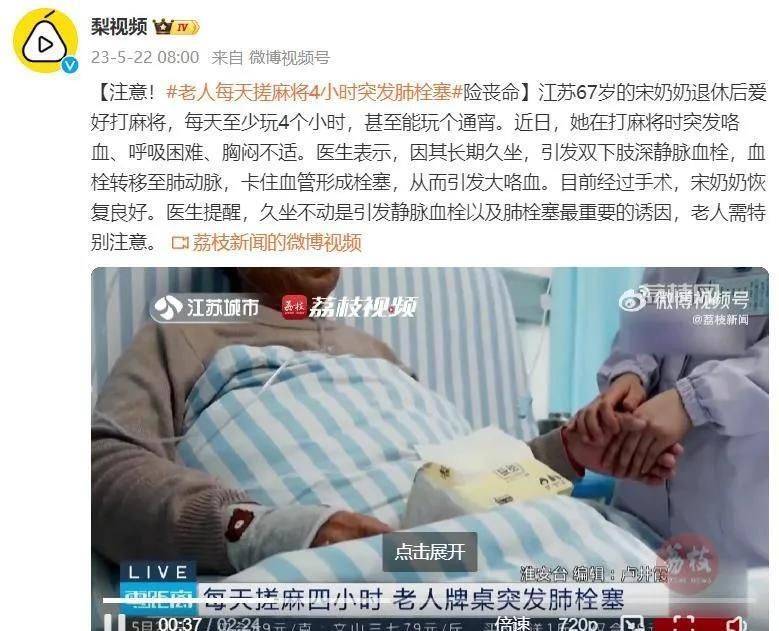 另一个案例是,一位老人在退休后迷上了打麻将,每天坐着玩四五个小时,结果因肺部血栓差点丧命。 医生诊断,这正是久坐导致血液循环不畅引起的。