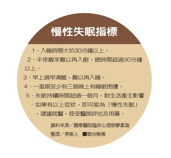 国泰医院临床心理师廖柔涵表示,许多睡不好的人都已罹患了“慢性失眠”,个人主观觉得睡眠感受不佳,症状则包括入睡时间大于30分钟以上,半夜醒来难以再入眠等。
