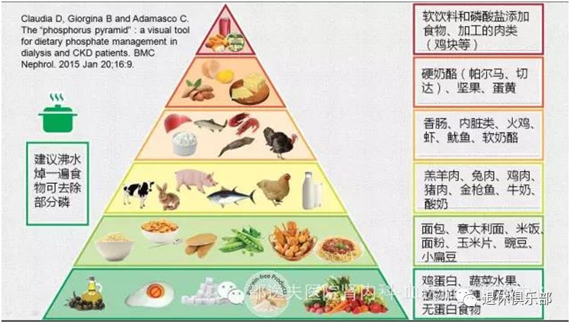 根据磷的含量,磷与蛋白的比值以及磷的吸收率,食物被分为6个等级,分别用不同的颜色区分。靠近底部的食物对磷而言无需限量,而顶部的食物则是严格避免。