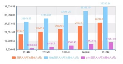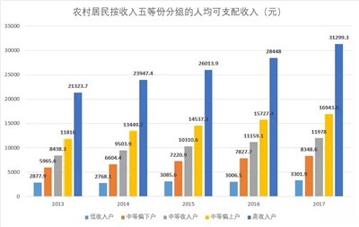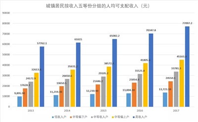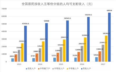 从2013年到2017年,低收入者与高收入者人均可支配收入差从43054.2元扩大到58975.6元。