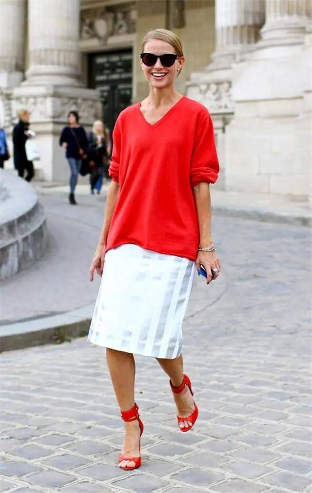 例如下面的这身搭配就结合了基础的白衬衫以及红色半身裙的搭配,白衬衫会给人一种非常干净清爽的感觉,而这类红色印花元素的加持就更加浪漫和大气,同时可以和“例假鞋”的色彩呼应起来,十分高级。职场女性可以多多借鉴这类搭配!