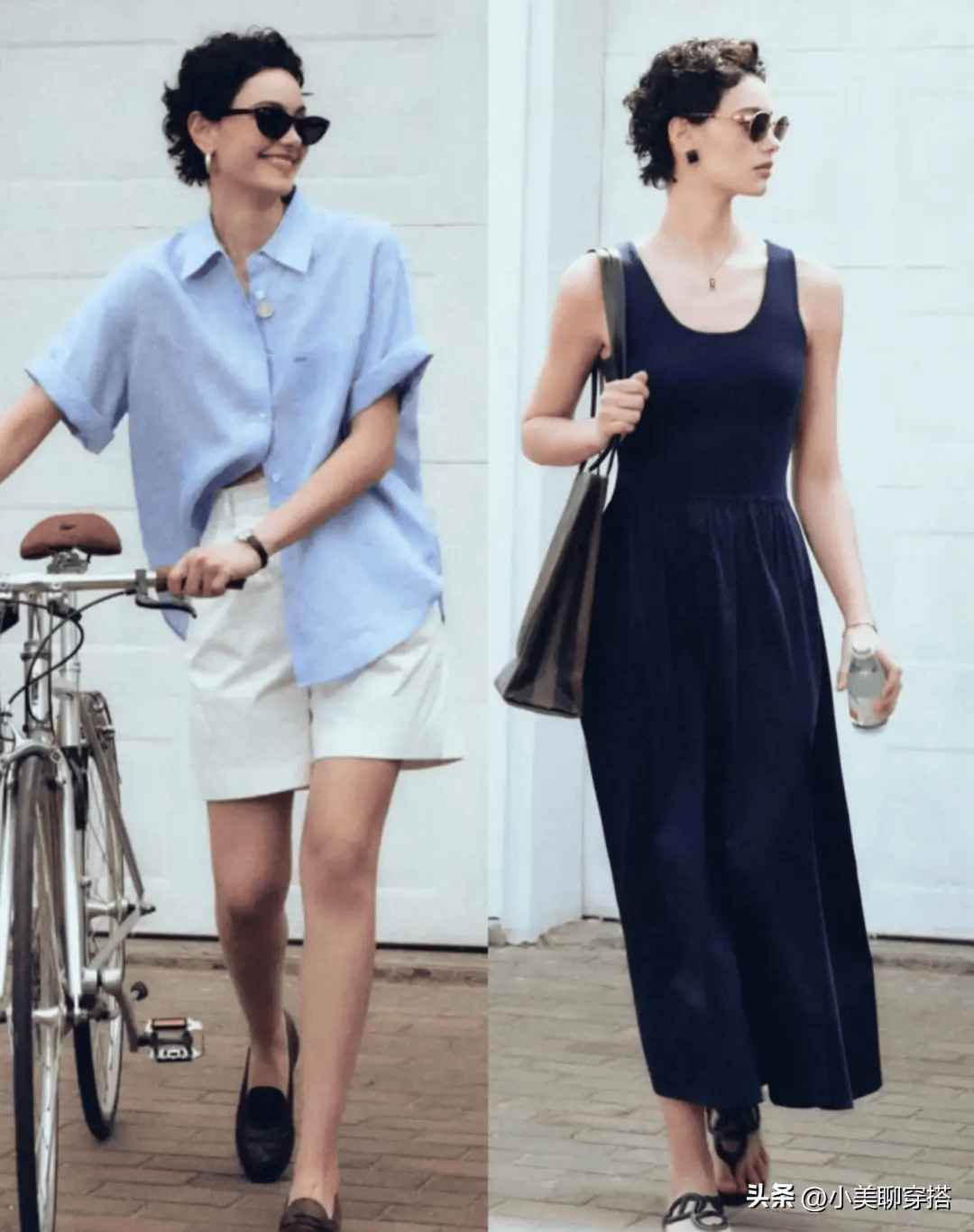 淡淡的水蓝色衬衫,搭配蓝白条纹短裤,配色也清新淡雅的,带着一些冷淡疏离感,很干净,蛮高级的配色。