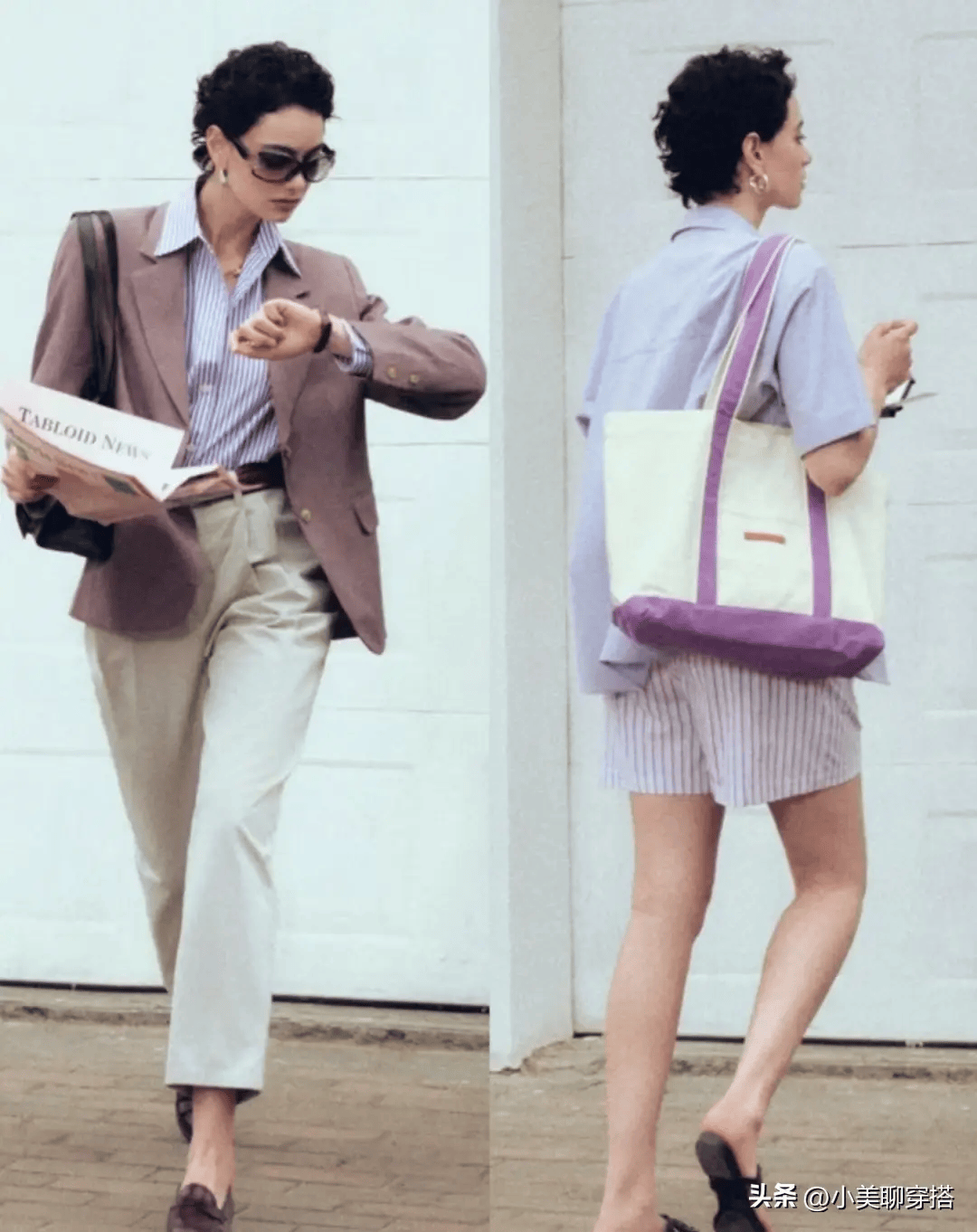 莫兰迪色系的烟雾紫色小西装,选择水蓝色条纹衬衫,配色清淡而知性,低饱和度的配色往往更具清冷的气质,而且让人觉得很舒服。