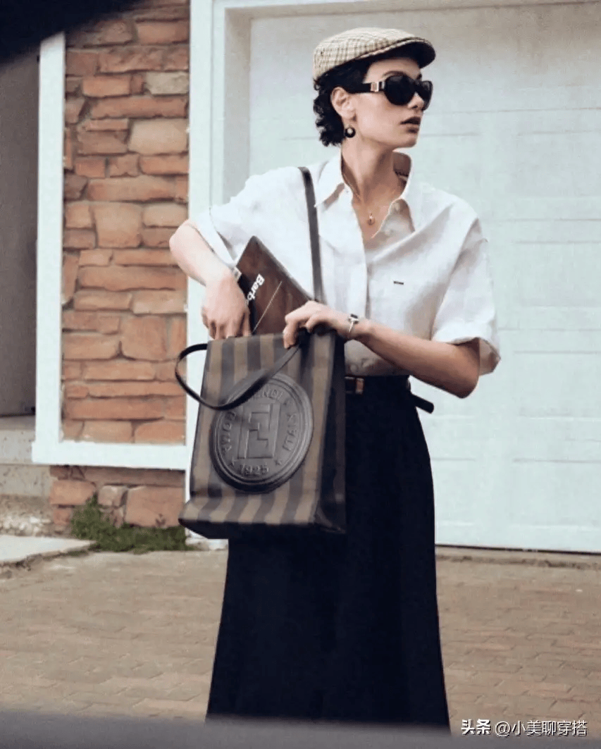 初夏,简约设计的白色翻领牛津衬衫,搭配经典黑色西裤,偏中性风格,有一种知性简约的美,带着十足的书卷气。