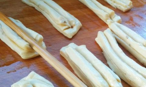 然后把面揉成光滑柔软的面团,放置一边醒20分钟左右。砧板涂一层油,将发好的面倒出再揉一揉,拉长条用手按压,切成相等的小块。两个叠放在一起,再用一根筷子在中间压一下。压的时候,要用一些力气,这样后面炸出来的油条不容易松开。