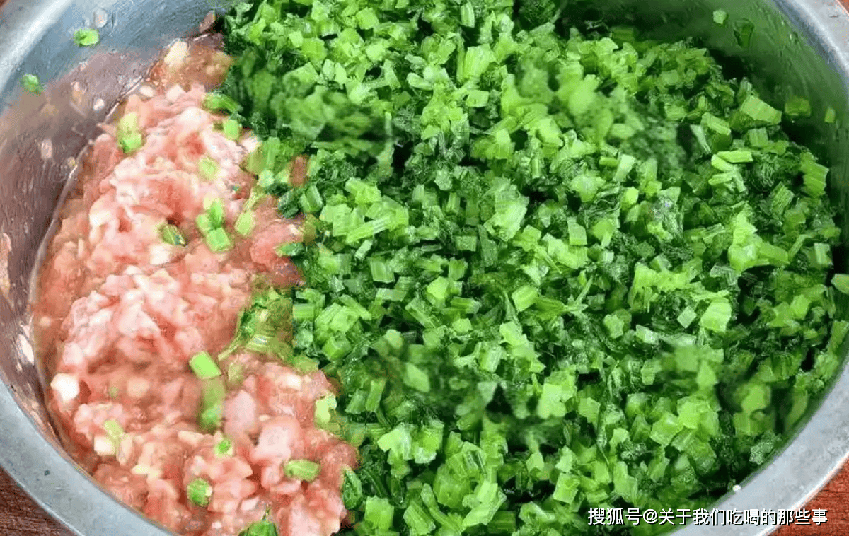四、蔬菜处理好剁碎,加少许油搅拌,再倒进肉馅中搅拌均匀。(不同的蔬菜处理方式不同,比如韭菜,一切都准备好了再加切碎,并立即裹上油放进肉馅内;萝卜切丝焯水,挤去水分,再剁碎裹上油放进肉馅内。用对方法蔬菜不出水,可以和肉馅很好的混合在一起,口感才好)