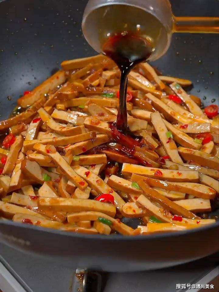 4、炒出红油后,倒入焯烫好的香干片。轻轻煸炒几下,让香干充分吸收调料的香味。此时,可以根据个人口味加入适量的生抽、老抽、蚝油进行调味。生抽提鲜,老抽上色,蚝油增加醇厚口感。翻炒均匀,使香干片均匀裹上调料。