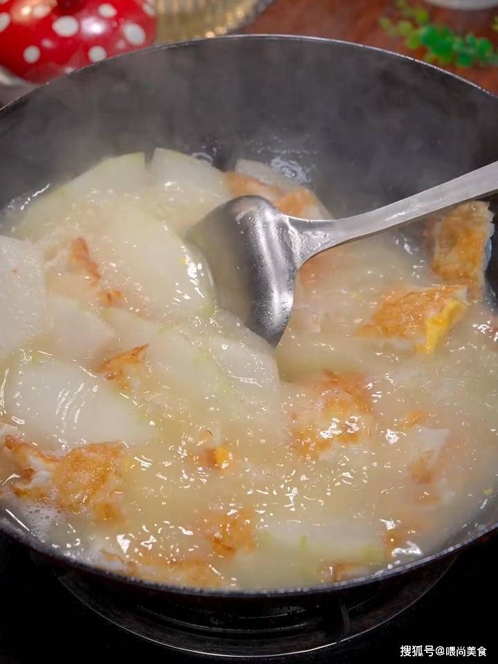 3、冬瓜炒至断生后,放入切好的鸡蛋块。接着,加入滚烫的开水。一定要用滚烫的开水,这样煮出来的汤才会奶白,营养也不会流失。开水的加入瞬间激发了冬瓜和鸡蛋的香味,使汤的味道更加浓郁。