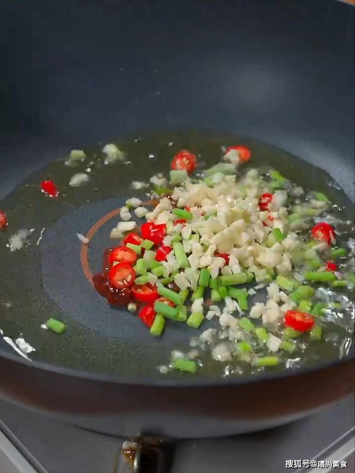 3、另起锅,锅中倒入适量的油,油热后放入一勺豆瓣酱、葱、蒜、小米椒。用铲子快速翻炒,炒出红油。这一步骤要掌握好火候,避免调料炒糊。