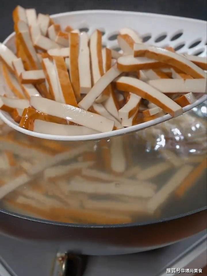 2、锅中加入适量的水,大火烧开。水开后,将香干片放入锅中焯烫 30 秒。焯烫的目的是去除香干的豆腥味,同时使其更加嫩滑。30 秒后,迅速将香干捞出,沥干水分。