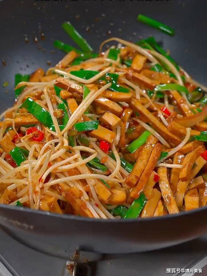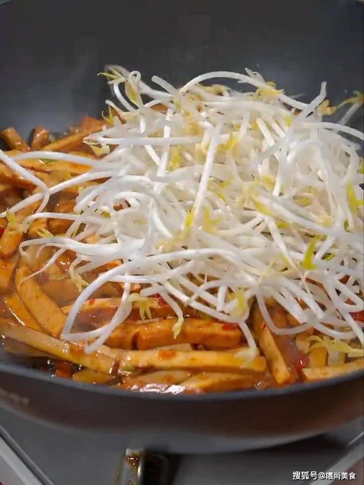 5、调味完成后,放入新鲜的豆芽。豆芽的加入为这道菜增添了爽脆的口感和丰富的营养。快速翻炒,使豆芽与香干充分混合。炒至豆芽断生,这个过程要注意掌握时间,避免豆芽炒过头,影响口感。