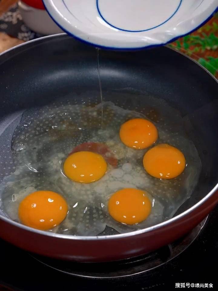 1、首先,锅中留热,倒入五个鸡蛋。用中小火煎至两面金黄。煎鸡蛋的过程中要注意火候的掌握,避免鸡蛋煎糊。煎好后,将鸡蛋切成嘴巴大小的块,备用。