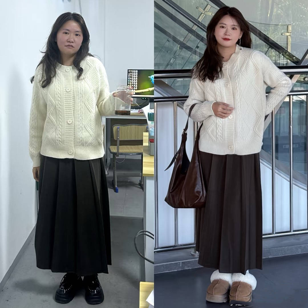 其实想要变得更时髦,化妆或者不化妆也相当重要。画一个淡妆,就更有气色、也更精致。穿白色开衫毛衣配棕色半身裙,也是优雅体面。白色开衫毛衣,穿起来温柔又显气质。