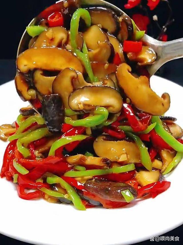 4、锅中烧油,油热放入葱花、蒜末、小米辣爆香,放入焯烫好的香菇和青红辣椒丝,翻炒片刻,淋入调好的料汁,快速翻炒均匀,盛出装盘即可。