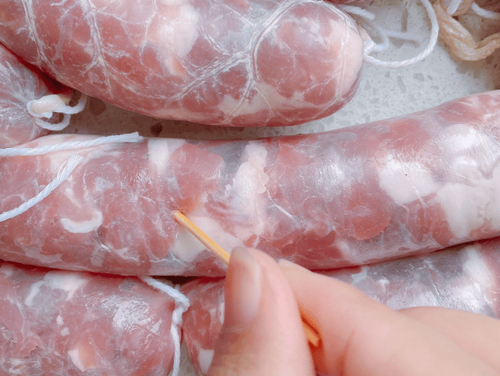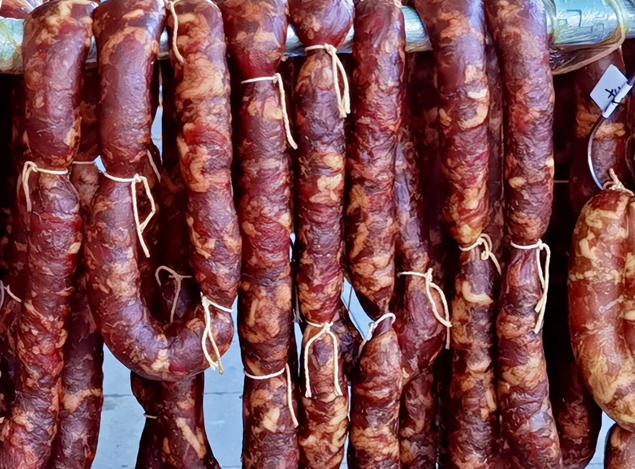6、灌好的香肠用针在肠衣上扎一些小孔,排出内部的空气和多余的水分,防止香肠在晾晒过程中变质或破裂。然后,将香肠挂在通风良好、阳光充足但又避免暴晒的地方晾晒,直到香肠表面变得干燥、紧实,颜色变为暗红色或棕色。