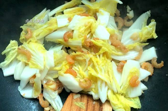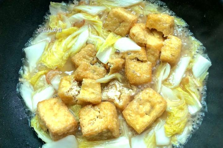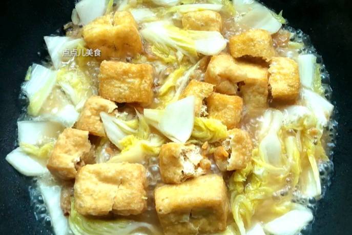 步骤3倒入白菜,开大火炒至变软,然后倒入适量的开水,再倒入油豆腐。
