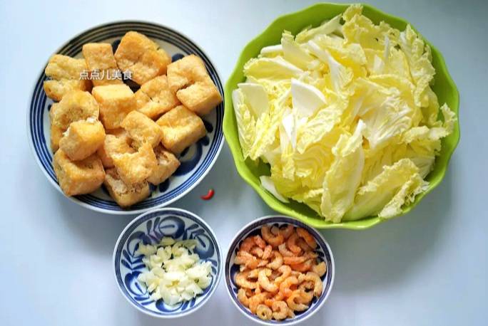 步骤1准备食材,白菜炒后体积会变小,所以油豆腐用量要比白菜少一些,虾米提前洗净泡软,白菜洗净切块,油豆腐撕开但不需要撕断,这样方便入味,蒜拍扁稍微剁一下。