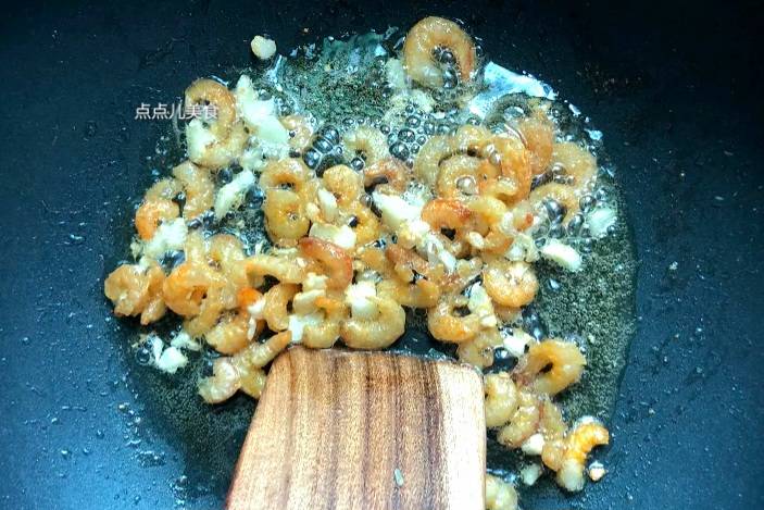 步骤2热锅加油,倒入蒜蓉,爆几秒钟放虾米,小火把虾米爆至金黄色,注意不要把虾米和蒜蓉都爆焦咯。