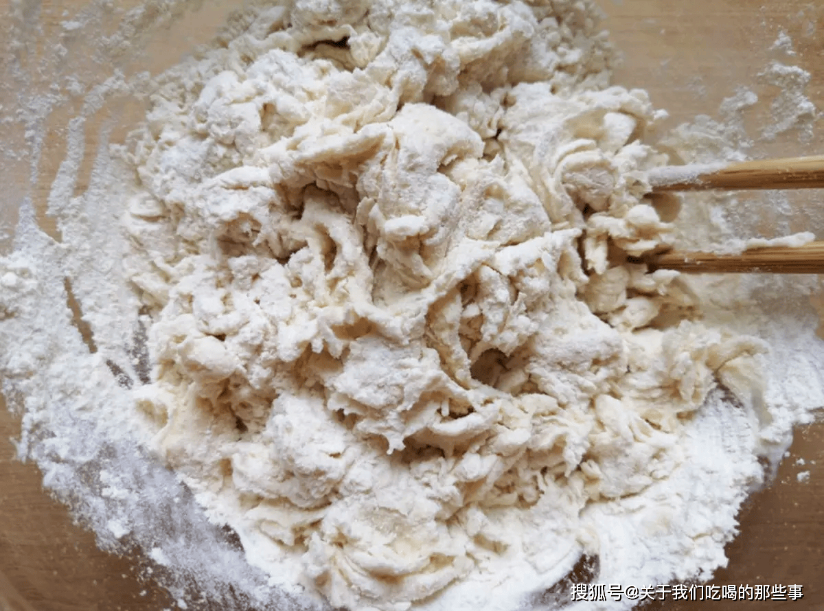 这样和面方式称为半烫面,就是面粉划分成两部分,一部分用冷水搅拌,一部分用开水搅拌,成絮状后再混合在一起,揉成面团。