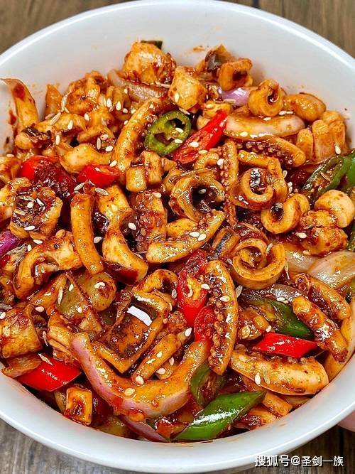 食材准备:鱿鱼、青红椒、姜蒜末、姜片、葱段。 做法流程: 1.鱿鱼清洗干净,然后改花刀切好,再起锅烧水,水烧开之后,加入料酒和姜片去腥,接着倒入鱿鱼焯水二十秒,最后捞出沥干水分备用。 2.切好青红椒和蒜末,再热锅烧油,油热以后,放入蒜末爆香,接着倒入青红椒一起翻炒均匀,炒出香味。 3.然后加入焯好的鱿鱼一起翻炒,再加入适量的料酒、食盐、生抽和白糖调味提鲜。 4.接着继续翻炒均匀入味,炒至青红椒断生以后,即可出锅开吃。