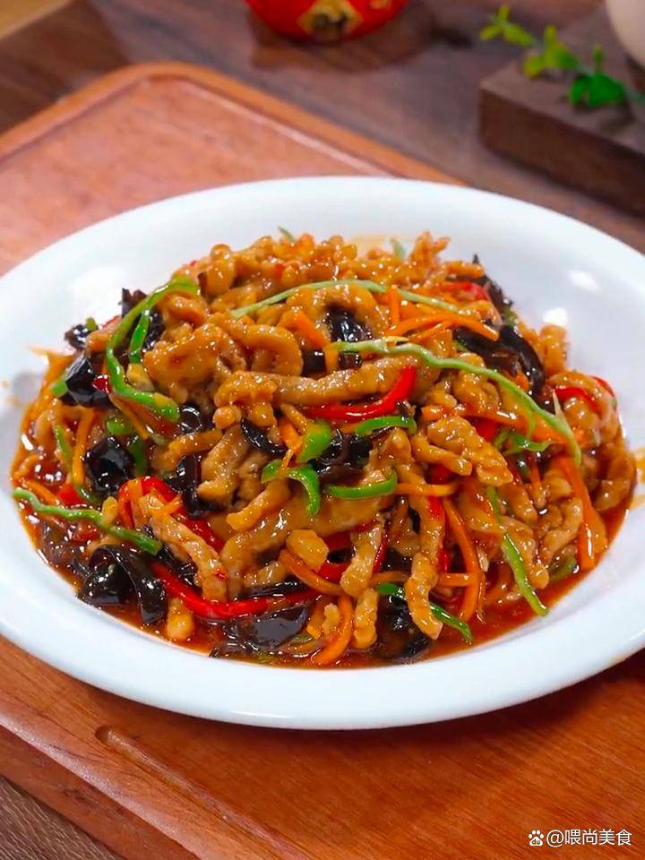 4、再放入胡萝卜丝、木耳丝、青椒丝,翻炒至断生,再放入肉丝,再倒入调好的料汁,翻炒均匀即可。