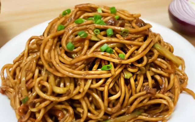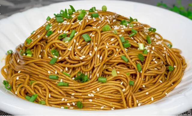 3、锅里水烧至冒泡,加入盐搅拌均匀,再把碱面放进来,用筷子搅散,煮开后将冷水搅动均匀。至七八成熟,马上捞进盆子里,加入食用油快速拌均匀,防止粘连在一起,再加入刚刚熬好的酱,焯过水的胡萝卜丝、黄瓜丝拌均匀,撒上葱花,炸酱面就做好了。