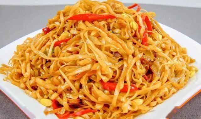 3、开始炒面条,锅里烧油,烧热后充分滑锅,把面条展开平铺在锅内,开小火慢慢的炒,不停旋转锅使面条受热均匀,把面条炒至两面焦黄色。