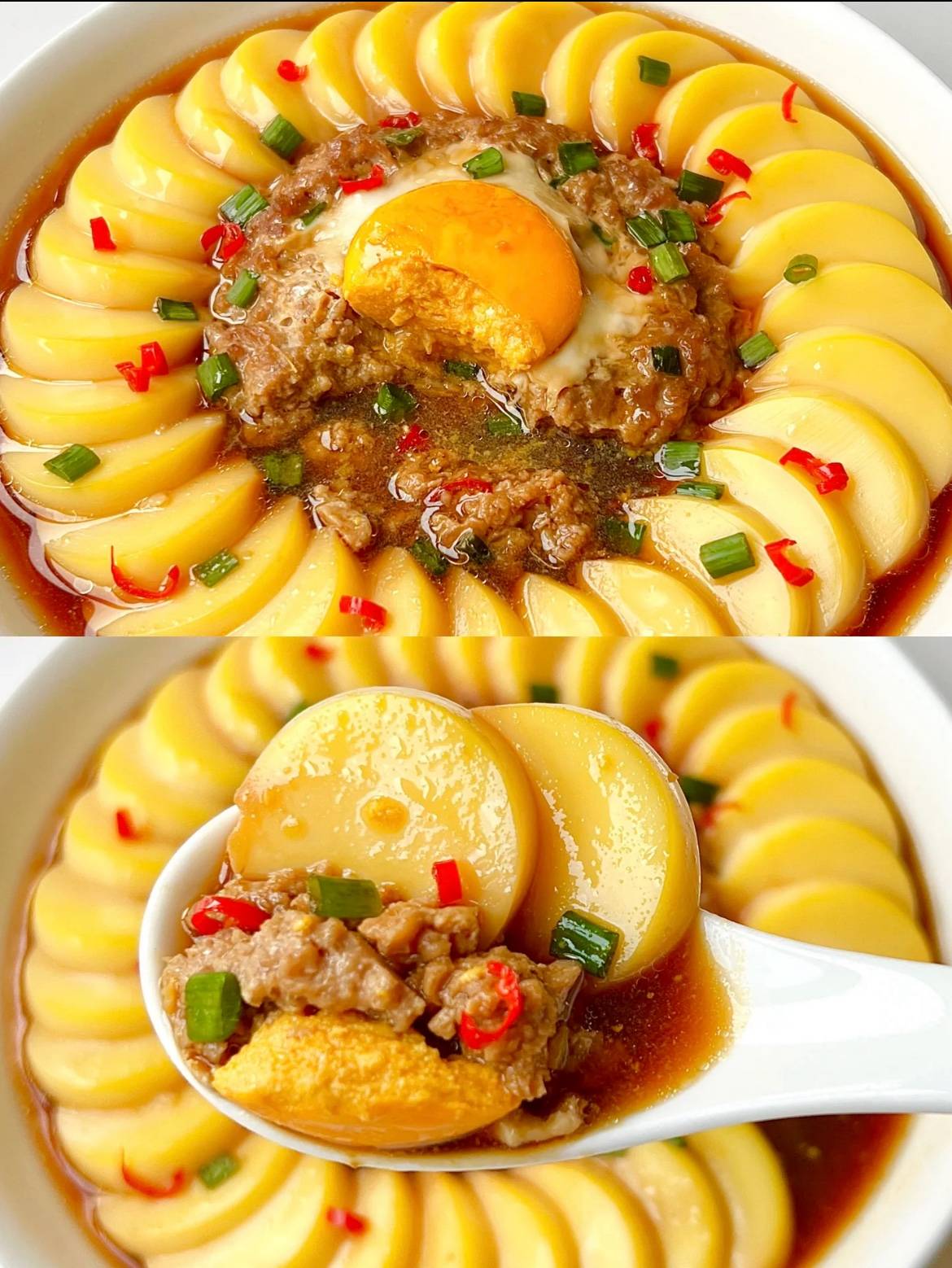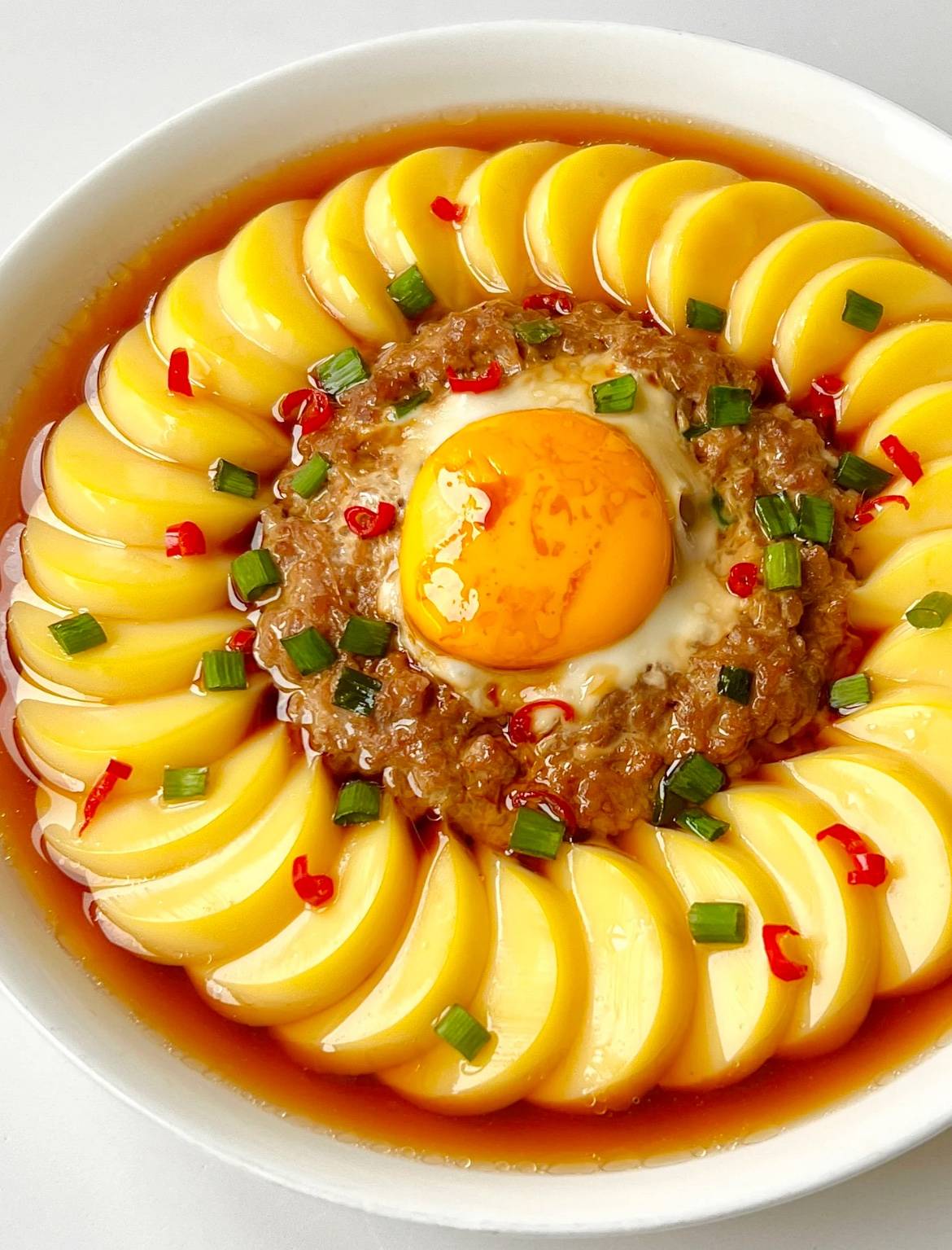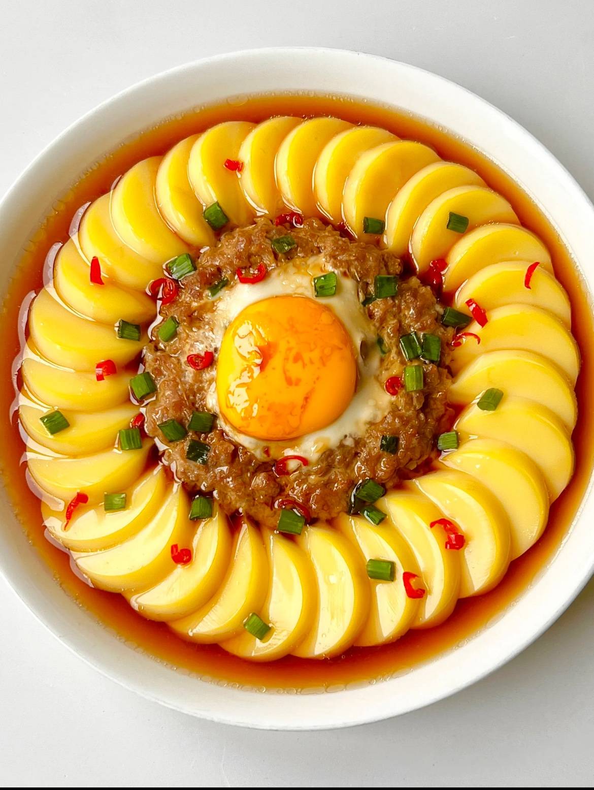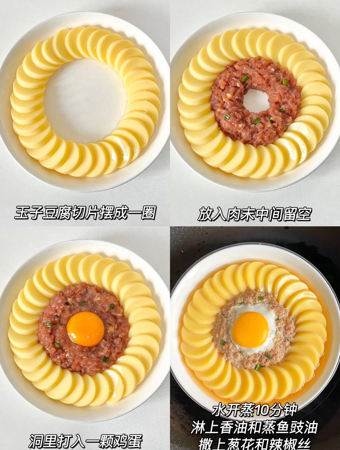 二、做法步骤 1. 处理食材: • 玉子豆腐切厚片,平铺在盘底; • 姜切末、葱和小米椒切细圈备用。 2. 腌肉馅: 猪肉末中加入姜末、葱花、生抽、料酒、蚝油、淀粉、香油和温水,顺时针搅拌至粘稠。 3. 组合蒸制: • 将腌好的肉馅铺在玉子豆腐上,中间轻轻压出凹槽; • 打入一个鸡蛋在凹槽中(可选全蛋或仅用蛋黄)。 4. 蒸制: 水沸后上锅,中火蒸10-12分钟(视肉馅厚度调整)。 5. 出锅点缀: 撒上葱花、小米椒圈,淋少许热油激香即可。