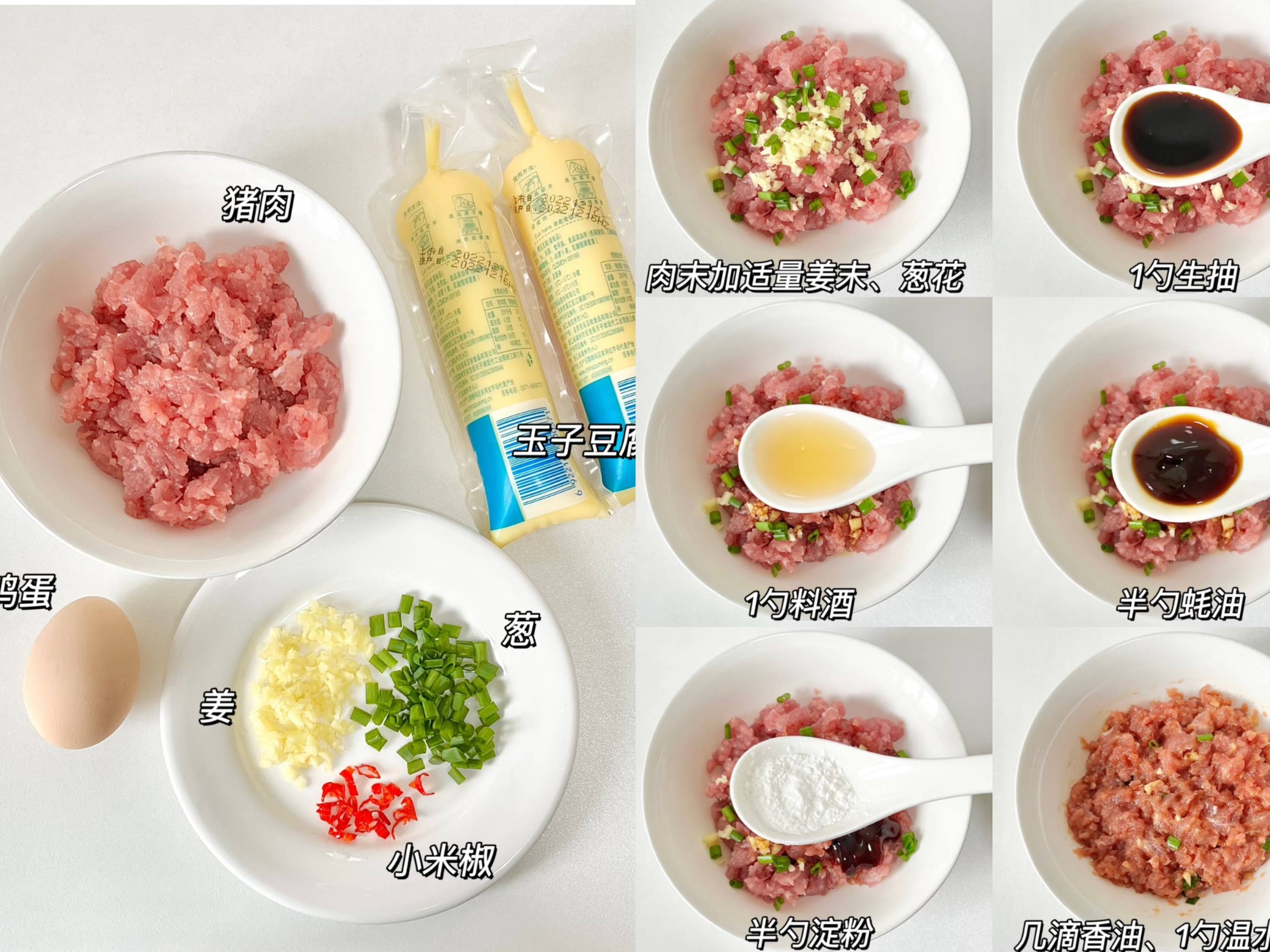 一、食材准备 材料: 猪肉末、玉子豆腐、鸡蛋、葱、姜、小米椒 腌肉调料: 姜末、葱花、1勺生抽、1勺料酒、半勺蚝油、半勺淀粉、几滴香油、1勺温水