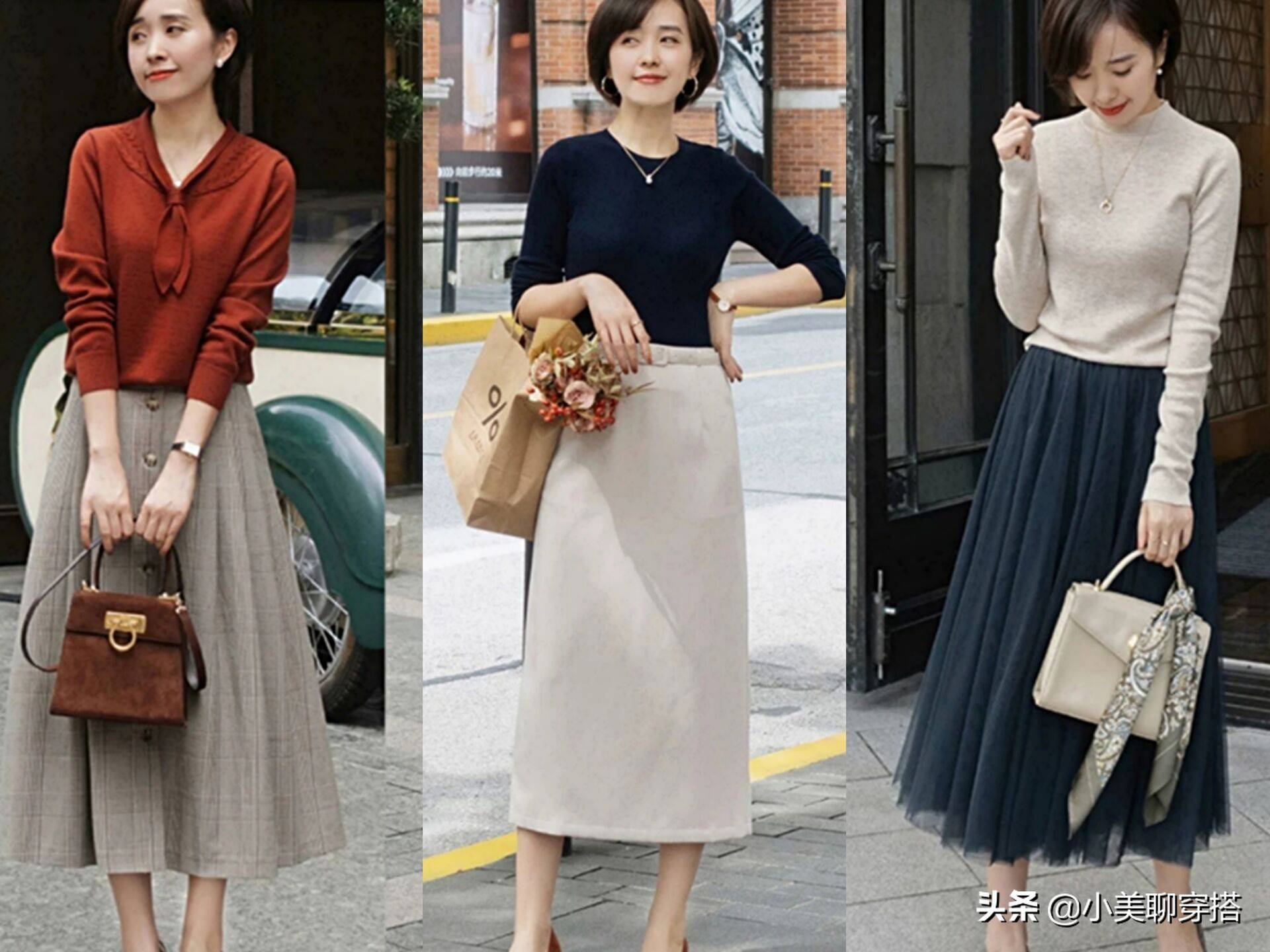 铁锈红针织衫,文气的飘带领设计更优雅精致,搭配灰色赫本裙,活泼清甜的味道,很温柔。暖灰色半高领针织衫,可以穿出好看的天鹅颈,搭配藏青色百褶裙,配色清新优雅,很有女人味。