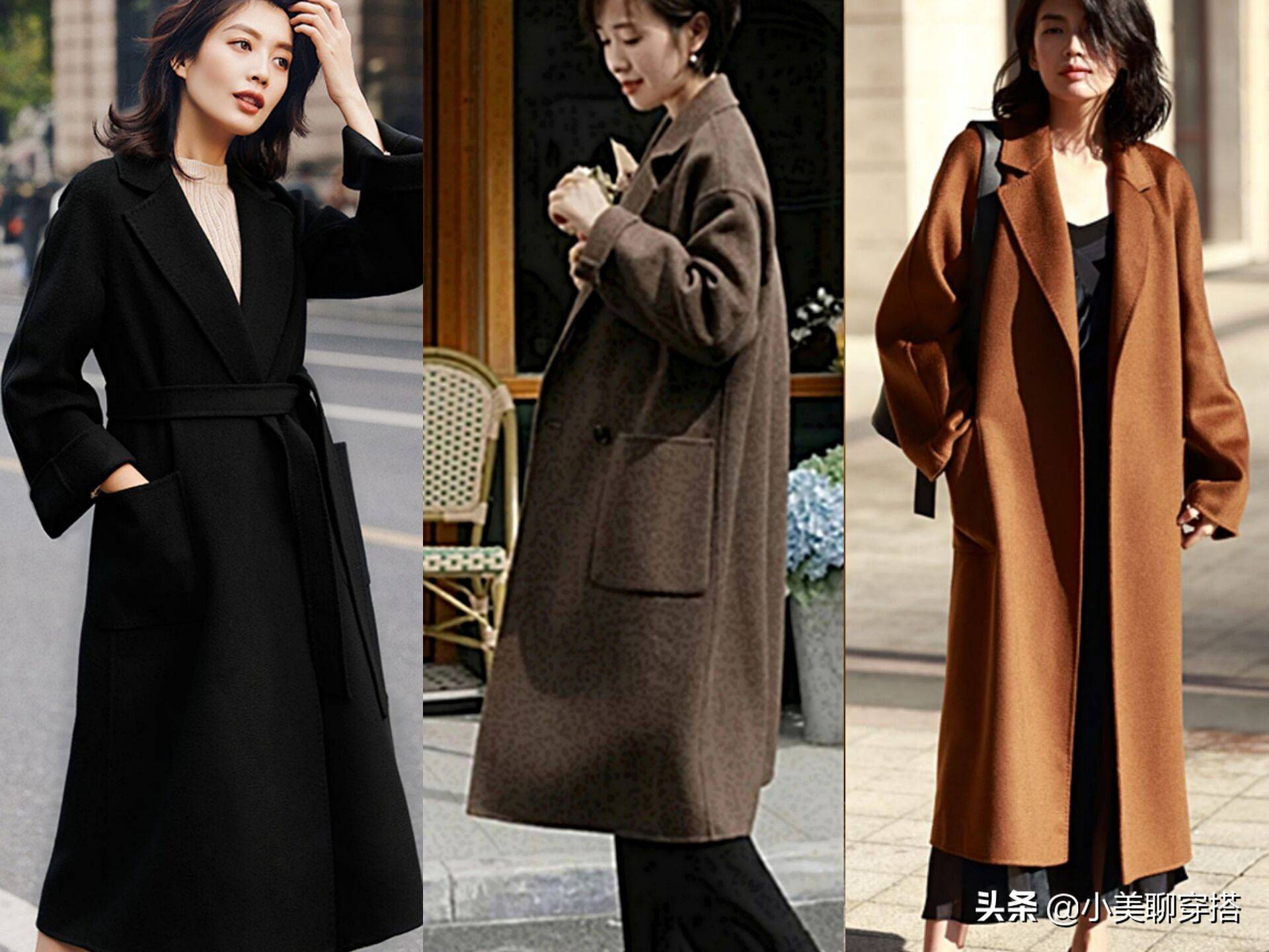 黑色浴袍款大衣,非常经典的款式,搭配米色毛衣,非常显白的配色,优雅知性中充满了高级感,很适合正式的场合,非常撑气场。巧克力色大衣是今年很流行的颜色,浓郁醇厚的色彩显得很有质感,搭配暖橘色毛衣与黑色烟管裤,看起来很高档,聚会上班都可以。
