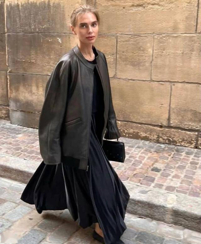 我们在搭配皮夹克时,可以选择一条轻盈材质或是垂坠感很不错的长裙,这样混搭效果更明显,刚与柔的碰撞,显得既时髦又很有女人味。