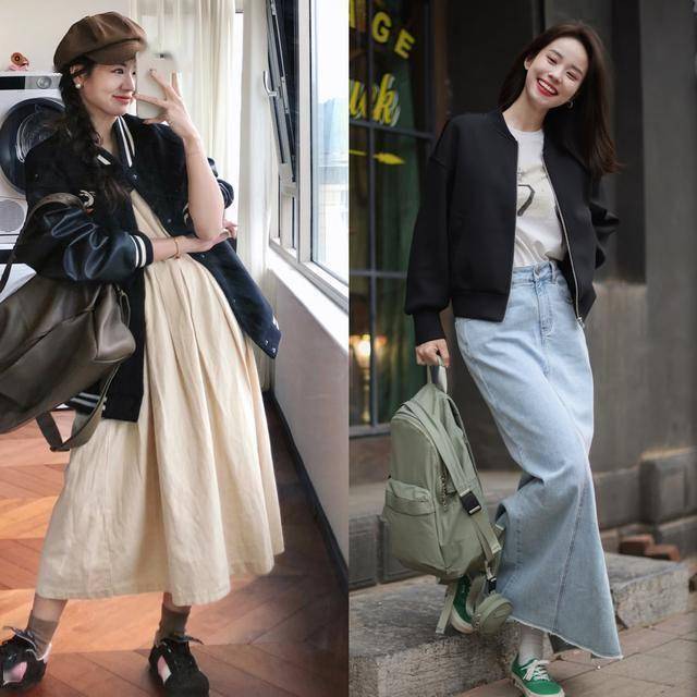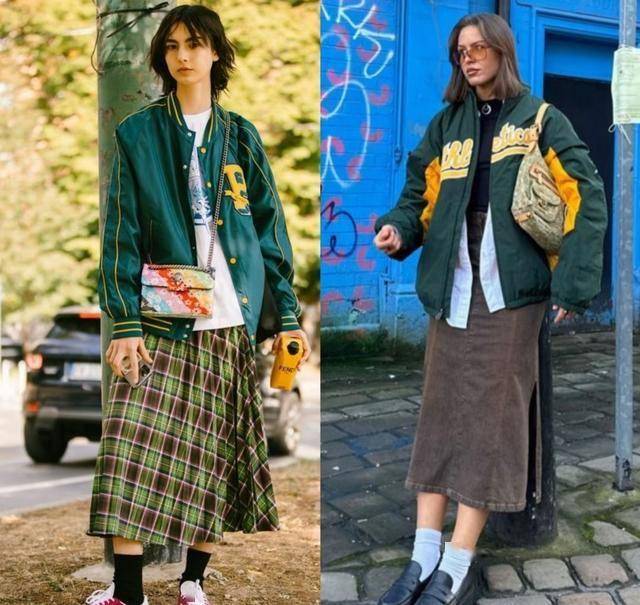 运动夹克中棒球服真的是太适合秋天了,它有一种青春气息又带着一些帅气感,而长裙,则承载着沉静、优雅与浪漫风情,当它们相遇,仿佛一个活泼开朗的女孩,在秋日午后在校园里漫步,显得鲜活灵动,可爱软萌。