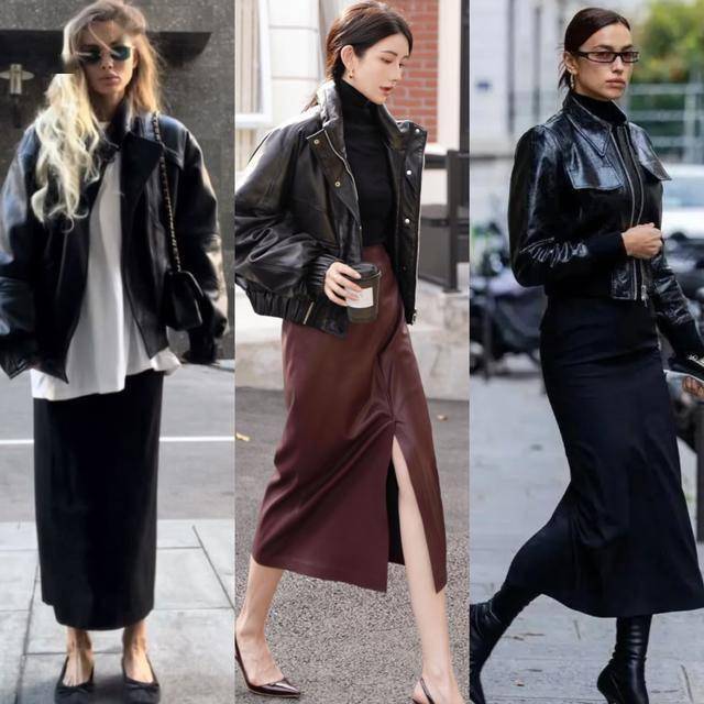 如果是职场女生,短款的黑色皮衣,更有一种利落与力量感,显得人很精干,这时候搭配一条直筒半裙,增加了端庄感,同时又显得知性雅致,很适合上班,具有一定的专业性,同时又很飒很美。