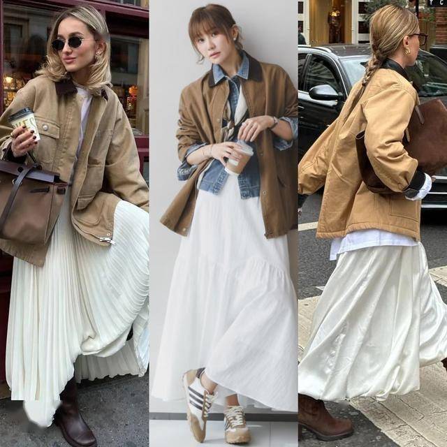 谷仓夹克一般都是以卡其布、灯芯绒布为主要的面料,它有一种挺括感,增加了硬朗帅气的男友风格,这时候可以配一条温婉优雅的白色长裙,立马多了浪漫清纯的少女感,减龄好看。