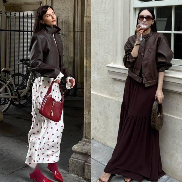 咖色的短款皮夹克,搭配咖色雪纺长裙,是摇滚精神与浪漫主义的奇妙融合,散发着甜美温婉又优雅的气质,很适合晚宴。