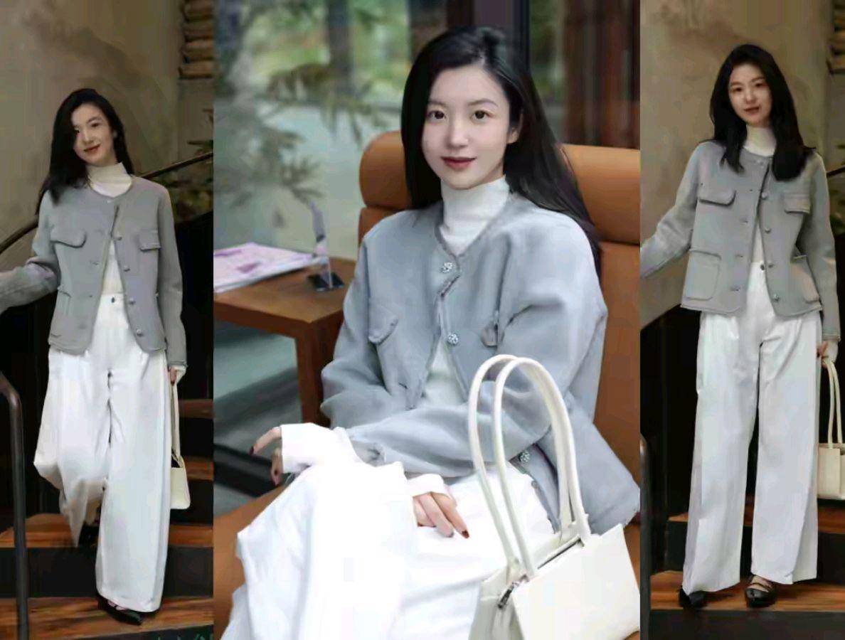 如秋冬季节的白色高领打底衫,温暖又显白。下装搭配白色棉质阔腿裤,竖向拉长身形。出门在外,穿上灰色小香风,造型优雅时髦又简约高级。